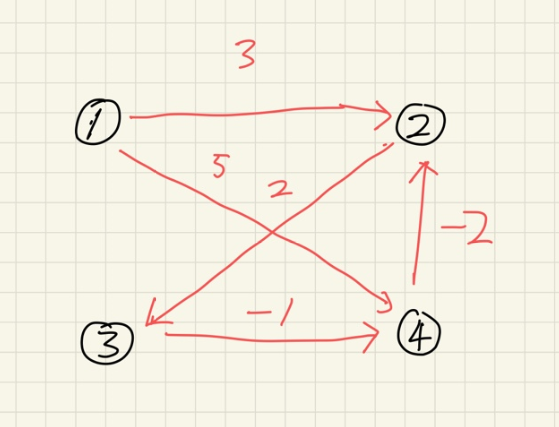 최단 경로를 갱신하는 경우 우선선위 큐에 push하고 큐가 모두 빌 때까지 반복하므로 아래 그림과 같이 1에서 4까지의 경로가 2-3-4를 순환하면서 최단경로가 -1씩 무한히 갱신될 수 있다.