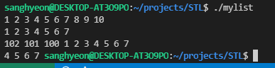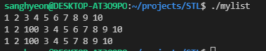 실행 결과 begin부터 2번 이동한 3번 위치에서 insert를 수행할 경우 3번 위치에 100을 삽입하고 3부터는 뒤로 밀리는 것을 알 수 있다. 그 다음 3번 위치부터 3번 이동한 6번 노드에서 erase연산을 수행하여 6번 노드가 사라진 최종 결과가 정확히 나왔음을 확인할 수 있다.
