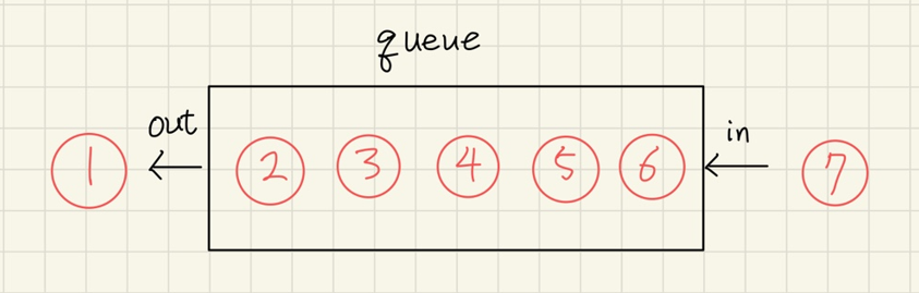 queue(큐)는 stack과 같은 기본적인 자료구조로 가장 마지막으로 들어간 원소가 가장 먼저 나오는 LIFO(Last In First Out)인 stack과 다르게 가장 먼저 들어간 원소가 가장 먼저 나오는 FIFO(First In First Out)이다. queue를 그림으로 표현하면 다음과 같다.