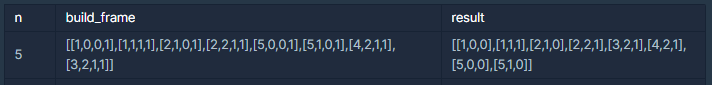 문제의 입력으로 벽면의 크기 n과 기둥과 보를 설치하거나 삭제하는 작업이 순서대로 담긴 2차원 배열 build_frame이 주어진다. build_frame의 원소는 다음과 같다.