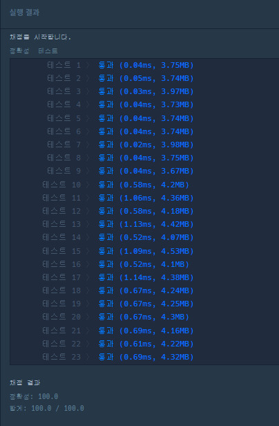 위의 규칙에 따라 기둥을 하나씩 설치하고 제거한 다음 구조물이 그래프에 완성된다. 구조물의 결과를 리턴해야하므로 각 좌표를 하나씩 순회하며 기둥은 위로, 보는 오른쪽으로 설치하므로 graph의 1차원 인덱스가 0이나 3일 경우 값이 참일 때 정답 벡터에 좌표와 기둥인지 보인지를 push_back해준다. 모두 넣은 다음 answer를 조건에 따라 정렬하여 리턴하면 된다. 위 코드를 실행할 경우 다음과 같이 모두 통과하는 것을 볼 수 있다.