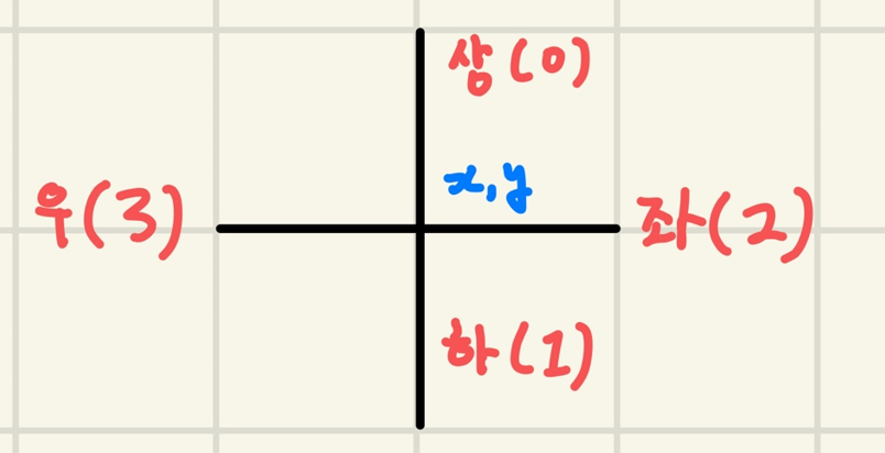 우선 마지막 조건을 보고 좌표에 시작점만을 표시한다면 문제를 풀기 굉장히 어려워진다. 따라서 3차원 배열을 이용하여 각 좌표에 상하좌우에 구조물이 있는지를 표시하였다. 그림으로 나타내면 다음과 같다.