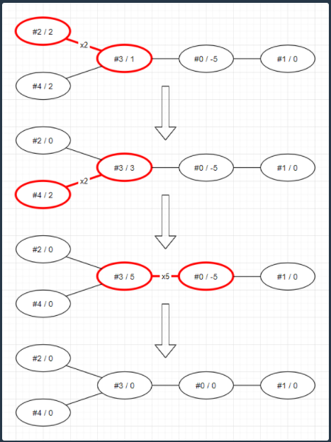 - 임의의 연결된 두 점을 골라서 한쪽은 1 증가시키고, 다른 한쪽은 1 감소시킵니다.