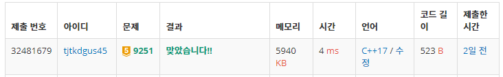 앞에 공백을 추가하는 이유는 1번 인덱스부터 사용하기 위해서이다. 대각선 값을 가져오는데 만약 첫 문자가 같은 경우 -1이 되므로 (1, 1)부터 인덱스를 시작하기 위하여 앞에 공백을 넣었다.