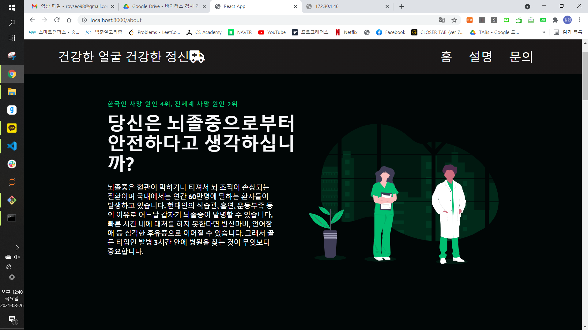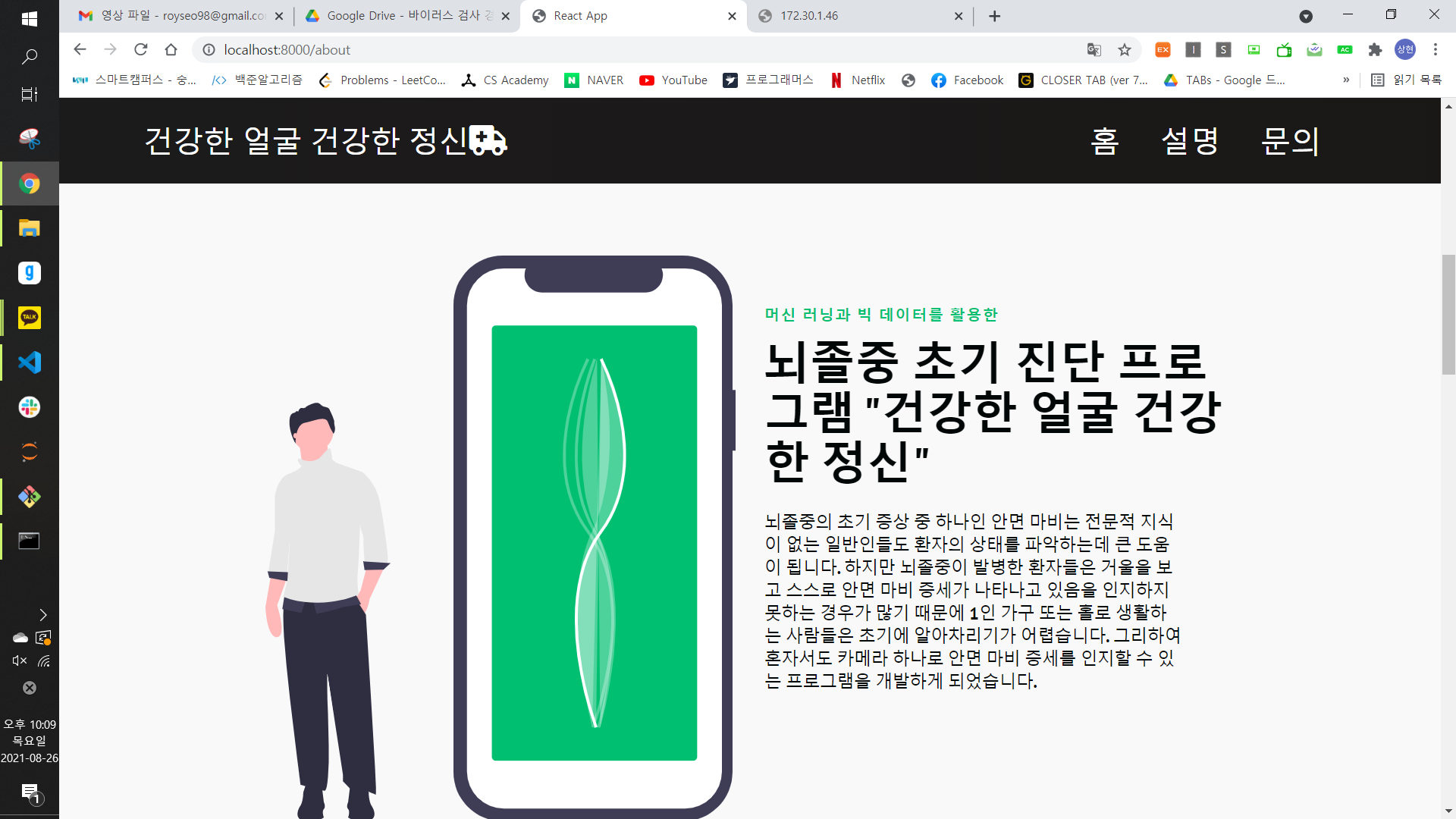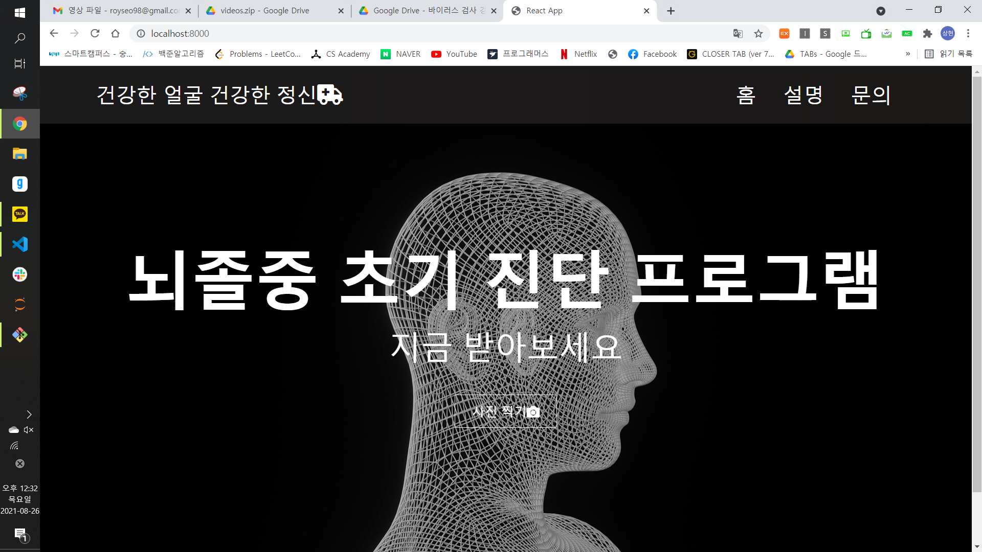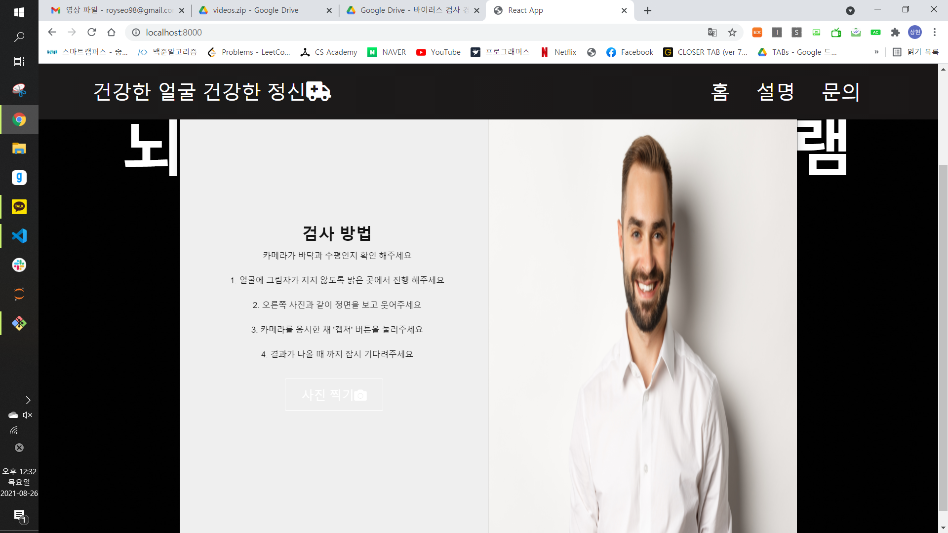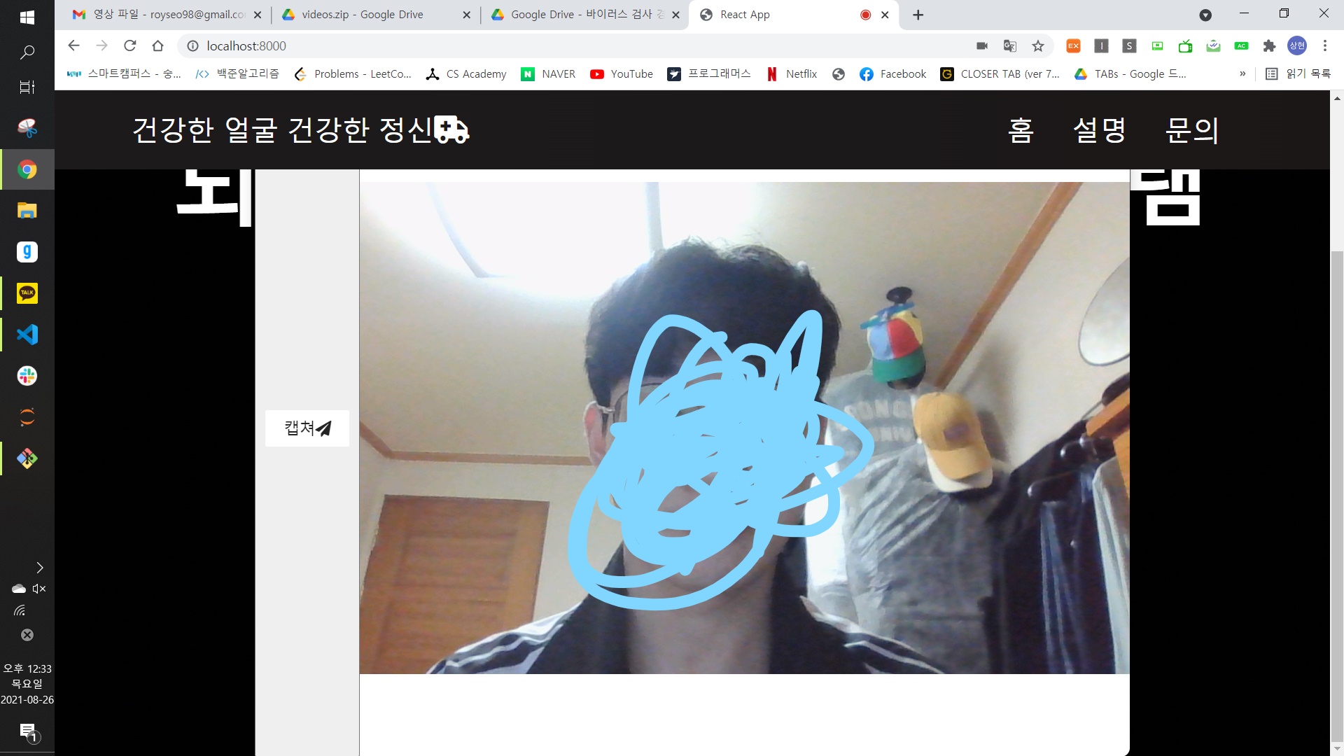 저번 글에서는 landmark detection이라는 오픈소스를 활용하여 얼굴의 특징점들을 얻고 각 거리를 구하여 얼굴의 비대칭성을 구했었다. 사용자가 쉽게 사용할 수 있는 방법이 웹캡을 활용하는 방법이었다. 따라서 노트북으로 홈페이지를 접속하여 얼굴을 찍어 넘기게 하였다. 프론트엔드는 리액트라는 자바스크립트 api를 활용하여 구성하였다.
