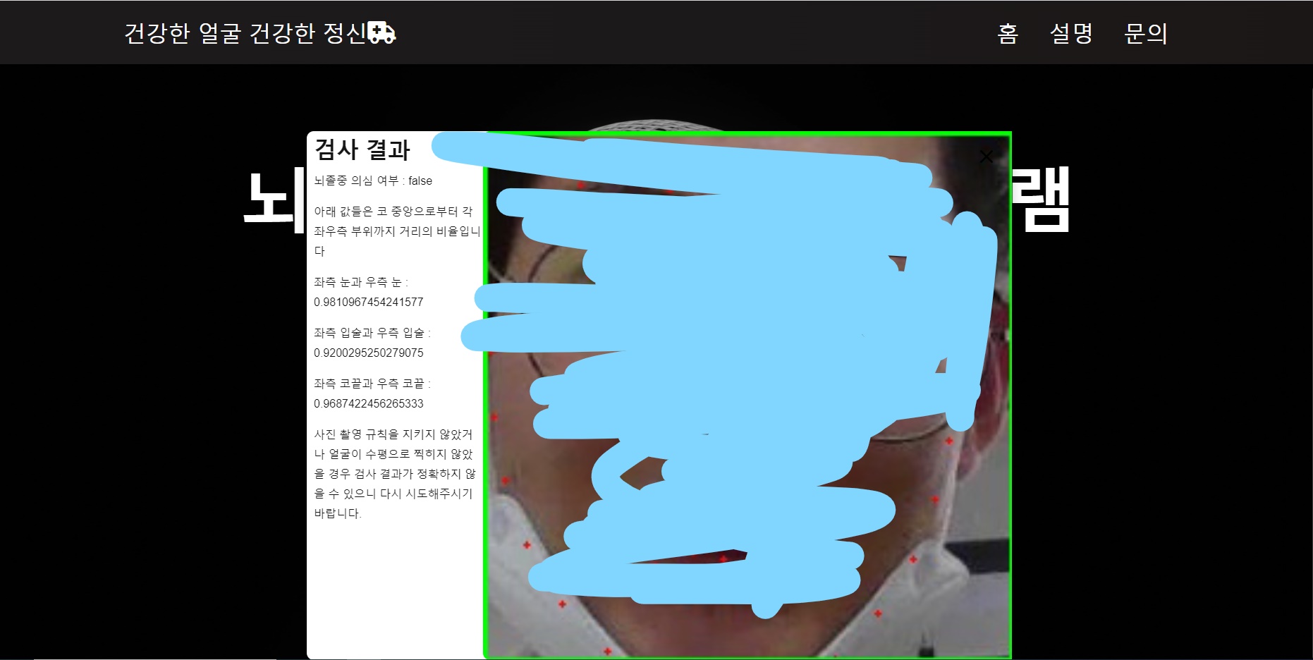 사진을 전송한 뒤 잠시 후 인식된 얼굴의 사진과 함께 계산에 사용된 얼굴 부위의 좌표들을 사용자에게 보여준다. 그리고 왼쪽에는 뇌졸중 의심 여부에 대한 판단과 함께 분석한 결과의 세부 사항들을 사용자가 참고할 수 있도록 출력하였다. 위 결과에서 뇌졸중 의심 여부 : false이므로 뇌졸중이 의심되지 않는 것으로 나온다. 또한 눈, 입술, 코의 비대칭성을 수치로 보여주어 어느 부위가 비대칭적인지 알 수 있게 하였다. 사진은 위에서 찍을 때와 다른 사진이다.