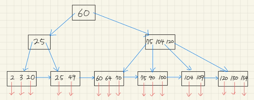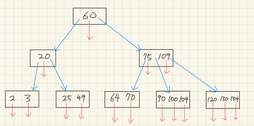이 B+Tree에서는 한 노드에 최대로 들어갈 수 있는 key의 개수가 3인 B+Tree이다. 여기서 리프노드가 아닌 non-leaf 노드의 키 왼쪽, 오른쪽에는 다음 노드를 가리키는 포인터가 존재한다. 실제 구현에서의 포인터는 주소이다. 그리고 leaf노드에서는 simple index 방식에서 주소를 가지는 것과 같이 각 key마다 실제 레코드파일의 포인터가 존재한다 위 그림에서는 빨간색 화살표 표시로 표현했다. 그리고 leaf노드는 다음 노드에 대한 포인터를 가진다(파란색 화살표). 이 포인터를 이용해 B+Tree에서는 순차탐색을 할 수 있는 장점이 있다. 또 하나의 특징은 임의의 노드에서 하나의 키값은 그 키 값의 오른쪽 SubTree의 가장 왼쪽 leaf node와 같다. 즉 루트노드인 60의 오른쪽 서브트리에서 가장 왼쪽에 있는 값이 60이라는 말이다. 다음 B-Tree에 대하여 설명하겠다. 아래 그림은 위 그림을 B-Tree로 나타낸 것이다.