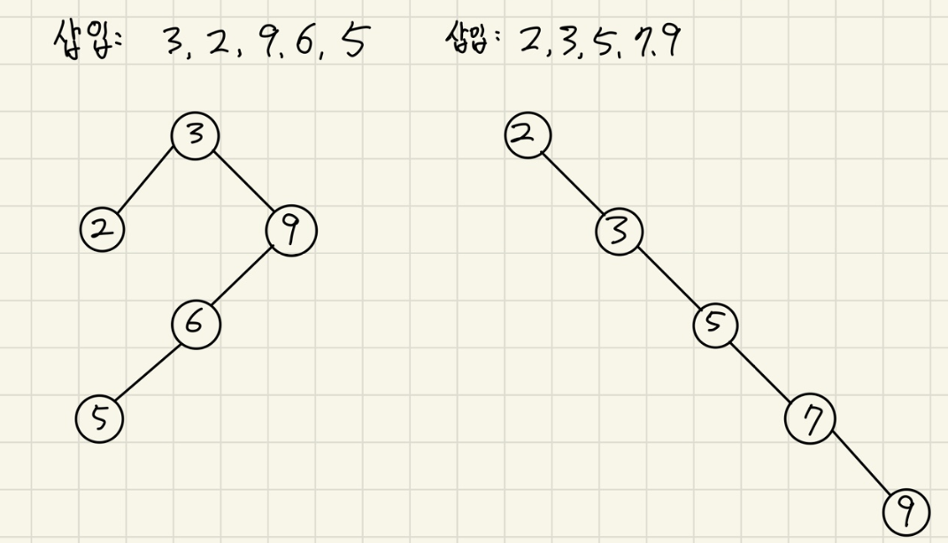 우선 잘 알려진 BST인 이진탐색 트리에 대하여 설명하자면 한 노드로부터 왼쪽에는 그 노드보다 작은 값, 오른쪽에는 큰 값이 있는 트리를 말한다. 아래의 그림과 같이 삽입 순서대로 노드를 탐색하며 해당 리프노드까지 비교한 다음 추가된다. BST는 평균적으로 O(logN)의 시간 복잡도를 가지며 레코드를 삽입, 삭제가 쉽다는 장점이 있다. 하지만 아래의 오른쪽 그림과 같이 한 쪽 방향으로 치우치며 트리가 형성되는 skew현상이 발생할 수 있다. 이 경우에는 시간 복잡도가 O(N)으로 순차처리와 같게 된다.