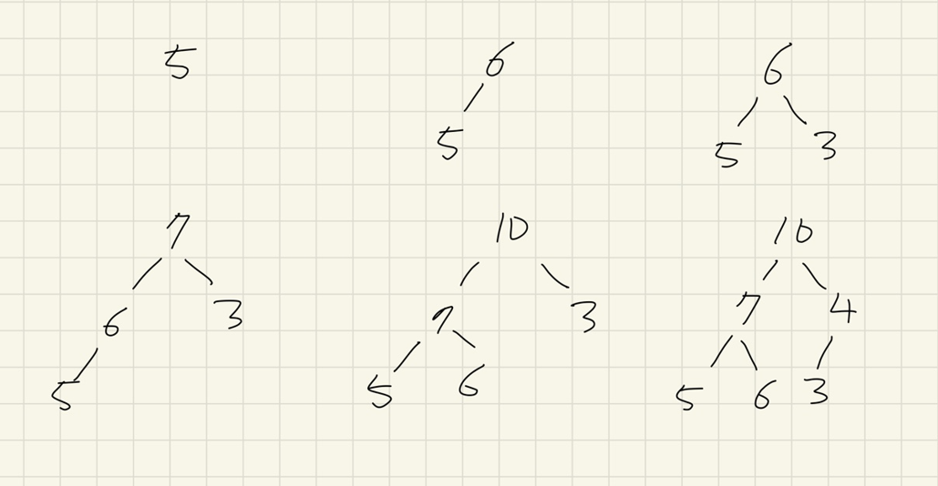 우선순위 큐는 힙을 이용한다. FIRST IN FIRST OUT인 queue와 다르게 우선순위가 높은 인자가 우선적으로 나온다. 힙의 push와 pop은 다음과 같이 동작한다. 예시는 5, 6, 3, 7, 10, 4가 순서대로 push될 경우 최대힙이 만들어지는 과정이다.
