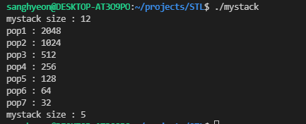 다음과 같이 12개의 원소가 잘 들어갔고 7개의 원소가 잘 pop된 것을 알 수 있다. template를 사용하였기 때문에 int형 변수 말고도 mystack을 사용할 때 <>안에 다른 자료형을 사용할 수 있다. ADT인 class나 struct도 사용할 수 있기 때문에 굉장히 편리하게 사용할 수 있다. 다른 STL 구현 코드들도 아래 링크에서 확인할 수 있다.